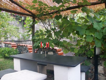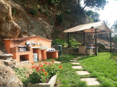 Allesterno vi č un giardino ricco di piante e fiori con un gazebo e un tavolo con panche in ardesia, fornello, lavandino in marmo e barbecue attrezzati con tutto loccorrente per poter cucinare allaperto.