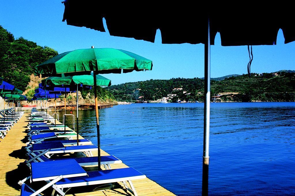 Ad attendervi in una caletta privata di scoglio, alla quale si accede mediante un ascensore panoramico, troverete, attrezzate con ombrelloni e lettini, una spiaggia realizzata con sabbia riportata su banchina e due grandi pontili di legno marino dove rilassarsi al sole; l’accesso al mare direttamente dai pontili è possibile tramite scalette. In alternativa, potrete rilassarvi nelle nostre due piscine di acqua di mare, di cui una con idromassaggio, corredate da un grazioso giardino in cui poter gustare un drink godendovi la vista su Porto Azzurro.