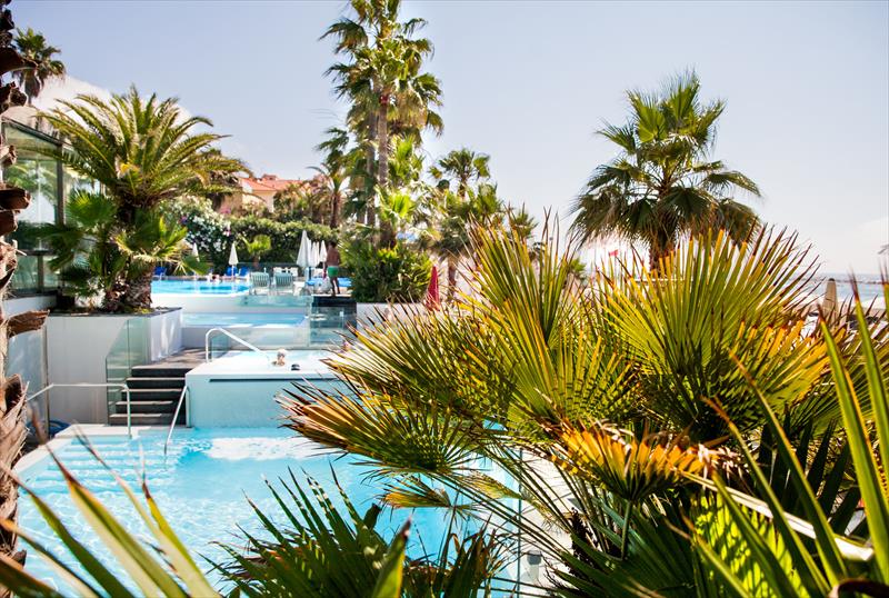 Spiaggia privata con lettini, ombrelloni e cabine, piscina a temperatura ambiente con idromassaggio, piscine talassoterapiche riscaldate esterne e coperte. Centro benessere con bagno turco, sauna, idroterapia plantare e doccia affusione.