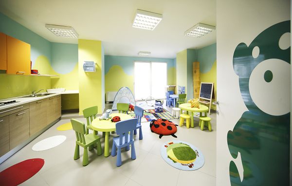 Baby room attrezzata con giochi, biberoneria e cucina a disposizione delle mamme