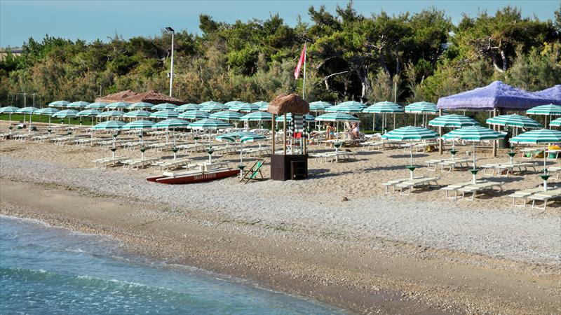 La comodità dell’accesso diretto, a due passi, è riservata agli ospiti. È una spiaggia lunga di sabbia e sassolini, fornita di lettini e ombrelloni. Impagabile è lo spettacolo del mare a tutte le ore e la nuova pista ciclabile che lo costeggia è tutta da scoprire, illuminata di sera.