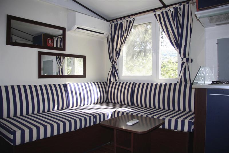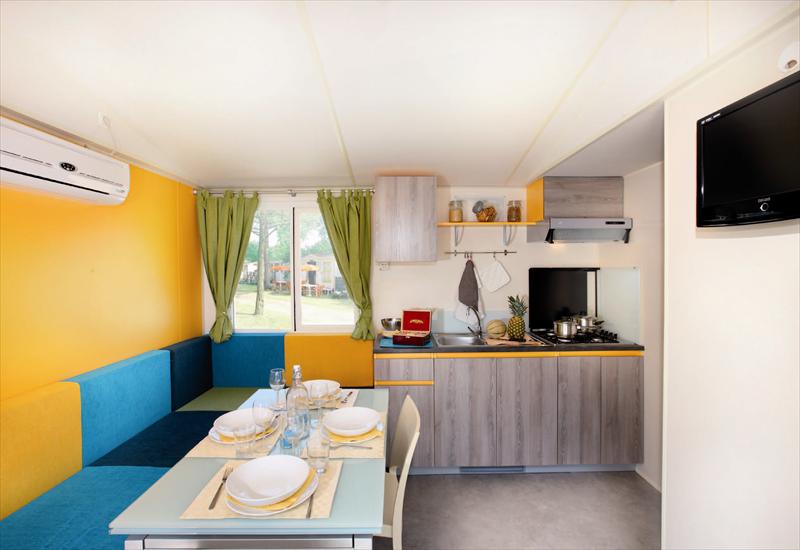 Le Mobilhome sono strutture in vetroresina che dispongono di 2 camere da letto, ognuna con il proprio bagno privato, per un totale di quattro comodi posti letto, e di un salotto cucina con tavolo da pranzo e divano trasformabile in letto. La cucina e´ completamente attrezzata di piatti e stoviglie e dispone di fornelli a gas e frigo. Inoltre è presente la televisione ed il condizionatore d´aria.