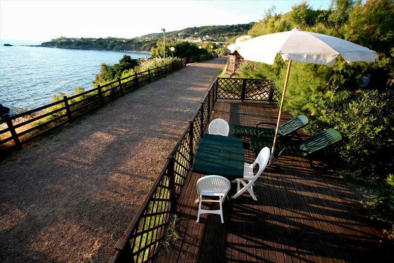 Il Villaggio si estende in una pineta con vista e accesso diretto al mare, una scalinata vi porterà sulla nostra spiaggia di ghiaia attrezzata con ombrelloni e sdraie a noleggio.