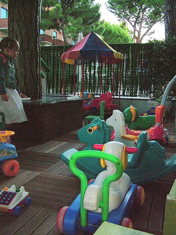 saletta giochi interna con Tv, cartoni animati, libri, giocattoli, colori... e area giochi recintata in giardino.