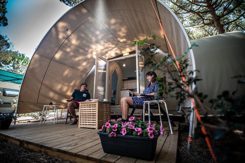 All’ombra di una pineta secolare sono situati bungalow trilocali, bilocali ed ampie piazzole per tende e roulotte.